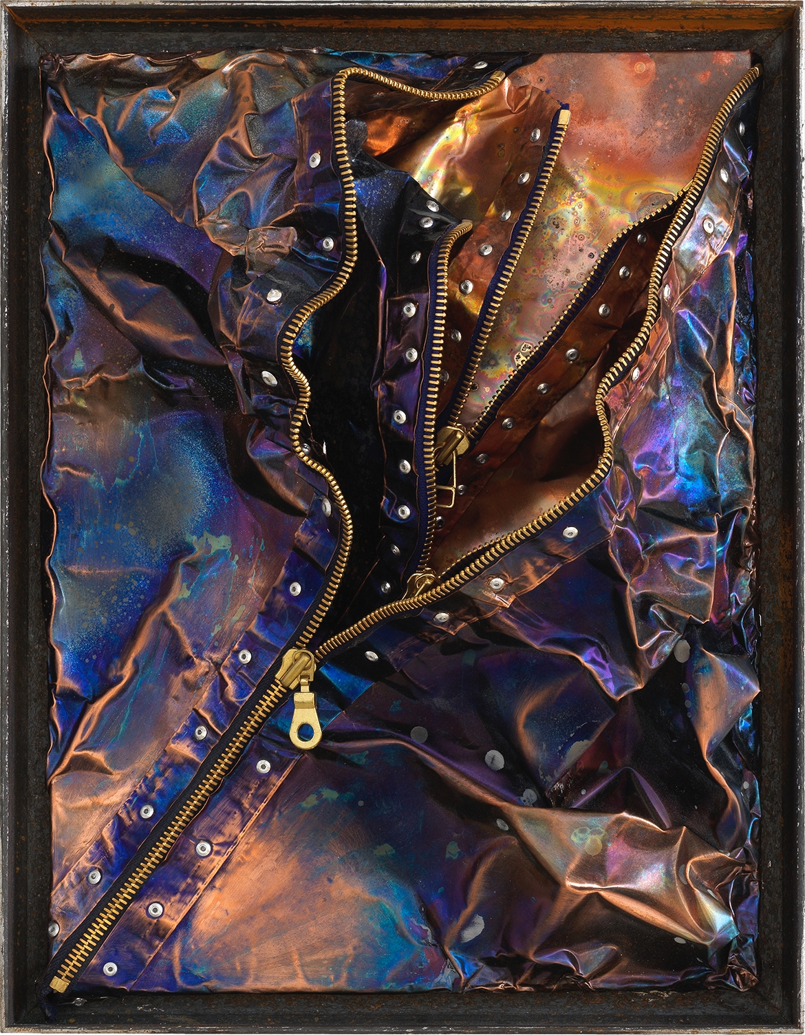 Titanbeschichtete Kupferblechinstallation auf Holzplatte mit geschweißter Eisenschattenfuge